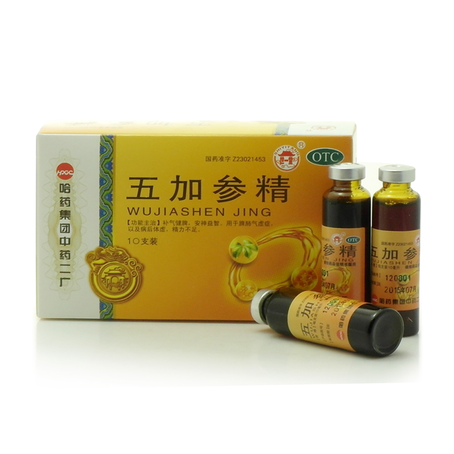 【药品名称】 通用名称:五加参精 汉语拼音:Wujiashen Jing 【成份】刺五加清膏175g、蜂蜜200g。 【性状】本品为红褐色的澄清液体;味甘、苦、微辛。 【功能主治】补气健脾,安神益智。用于脾肺气虚症,以及病后体虚,精力不足。 【用法用量】早晚空腹时温开水送服,一次10毫升,一日2次。 【注意事项】 1.忌油腻食物。 2.本品宜饭前服用。 3.按照用法用量服用,孕妇、小儿及年老体弱者应在医师指导下服用。 4.服药二周或服药期间症状未明显改善,或症状加重者,应立即停药并到医院就诊。 5.本品储存日久,可产生轻微沉淀,服时摇匀。 6.对本品过敏者禁用,过敏体质者慎用。 7.本品性状发生改变时禁止使用。 8.儿童必须在成人监护下使用。 9.请将本品放在儿童不能接触的地方。 10.如正在使用其他药品,使用本品前请咨询医师或药师。 【药物相互作用】如与其他药物同时使用可能会发生药物相互作用,详情请咨询医师或药师。 【批准文号】国药准字Z23021453 【生产企业】哈药集团中药二厂