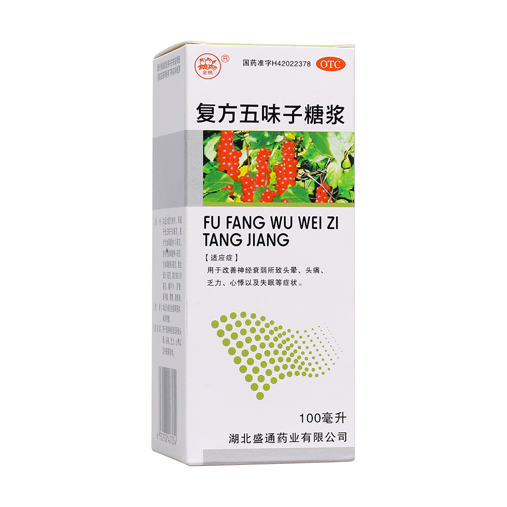 【药品名称】 通用名称:复方五味子糖浆 汉语拼音:Fu Fang Wu Wei Zi Tang Jiang 【主要成份】本品为复方制剂,每毫升含五味子30毫克、液状甘油磷酸钠10毫克、液状甘油磷酸钾6毫克、甘油磷酸铁3毫克、维生素B1 1毫克、氯化钴0.05毫克。 【性状】本品为棕色的粘稠液体;味甜带酸。 【功能主治】用于改善神经衰弱所致头晕、头痛、乏力、心悸以及失眠等症状。 【规格型号】100ml 【用法用量】口服。成人一次10~15毫升,一日2次。 【不良反应】尚不明确。 【禁忌】尚不明确。 【注意事项】 1.孕妇慎用。 2.对本品过敏者禁用,过敏体质者慎用。 3.本品性状发生改变时禁止使用。 4.请将本品放在儿童不能接触的地方。 5.如正在使用其他药品,使用本品前请咨询医师或药师。 【儿童用药】尚不明确。 【老年患者用药】尚不明确。 【孕妇及哺乳期妇女用药】尚不明确。 【药物相互作用】如与其他药物同时使用可能会发生药物相互作用,详情请咨询医师或药师。 【贮藏】密封。 【包装】瓶装,每瓶装100毫升。 【有效期】24个月 【批准文号】国药准字H42022378 【生产企业】湖北盛通药业有限公司