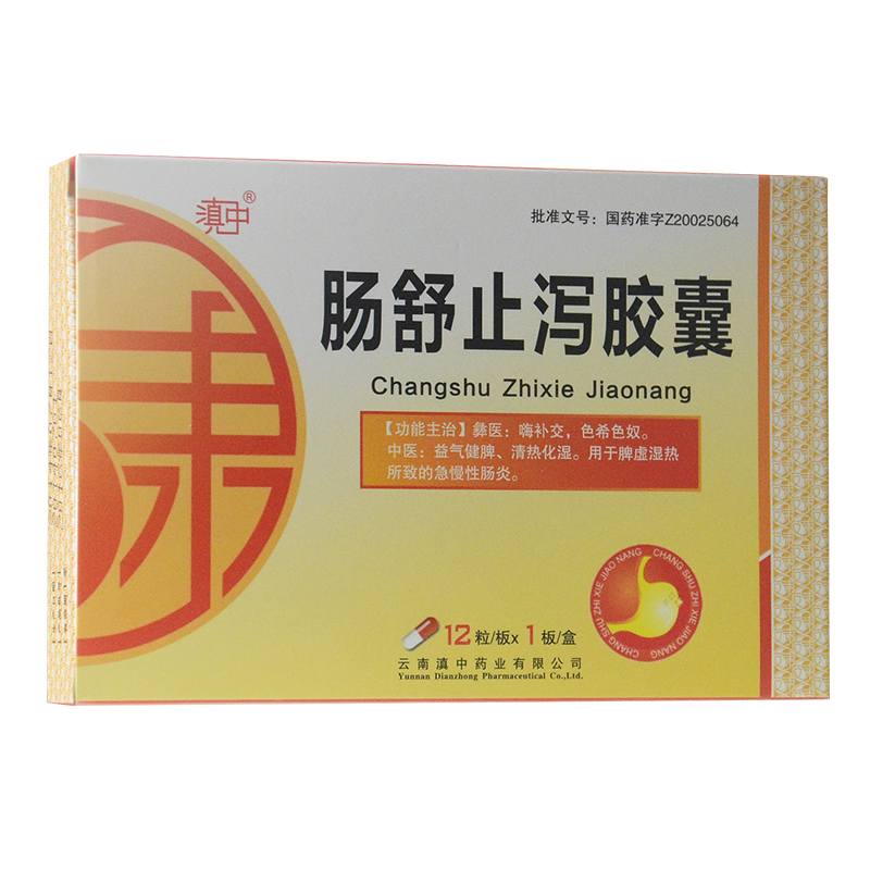 【药品名称】 通用名称:肠舒止泻胶囊 汉语拼音:Changshu Zhixie Jiaonang 【成份】鸡屎藤、砂仁、人参、山药、苍术(炒)、黄柏、黄连、木香(炒)、小茴香(炒)、肉豆蔻、诃子(去核)、甘草、山楂(炒焦)、硬脂酸镁。 【功能主治】益气健脾,清热化湿。用于脾虚湿热所致的慢性泄泻。 【规格】每粒装0.4克 【用法用量】口服,一次2~4粒,一日3次。儿童酌减;或遵医嘱。 【禁忌】孕妇禁用。 【注意事项】 1.饮食宜清淡,忌烟、酒及辛辣、生冷、油腻食物。 2.不宜在服药期间同时服用滋补性中药。 3.有慢性结肠炎、溃疡性结肠炎便脓血等慢性病史者,患泄泻时应去医院就诊。 4.有高血压、心脏病、糖尿病、肝病、肾病等慢性病严重者应在医师指导下服用。 5.服药3天症状无缓解,应去医院就诊。 6.儿童、年老体弱者应在医师指导下服用。 7.对本品过敏者禁用,过敏体质者慎用。 8.本品性状发生改变时禁止使用。 9.儿童必须在成人监护下使用。 10.请将本品放在儿童不能接触的地方。 11.如正在使用其他药品,使用本品前请咨询医师或药师。 【药物相互作用】如与其他药物同时使用可能会发生药物相互作用,详情请咨询医师或药师。 【批准文号】国药准字Z20025064 【生产企业】云南滇中药业有限公司