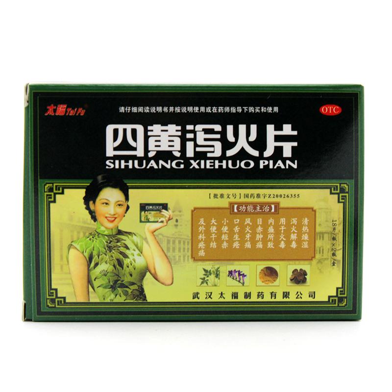 【药品名称】 通用名称:四黄泻火片 汉语拼音:Sihuang Xiehuo Pian 【成份】 盐酸小檗碱、黄芩浸膏(相当于黄芩苷7.35g)10.5g、人工牛黄5g、大黄200g、硬脂酸镁3g、羧甲基淀粉钠10g、淀粉。 【功能主治】清热燥湿,泻火解毒。用于火毒内盛所致目赤肿痛,风火牙痛,口舌生疮,小便短赤,大便干结及外科疮疡。 【规格】每片重0.25克(含盐酸小檗碱7毫克) 【用法用量】口服,一次4片,一日3次。 【不良反应】偶有恶心、呕吐、皮疹和药热,停药后消失。 【禁忌】1.孕妇禁用。 2.溶血性贫血患者及葡萄糖-6-磷酸脱氢酶缺乏患者禁用。 【注意事项】 1.忌烟、酒及辛辣食物。 2.不宜在服药期间同时服用滋补性中药。 3.脾胃虚寒者慎用。 4.有高血压、心脏病、糖尿病、肝病、肾病等慢性病严重者应在医师指导下服用。 5.本品含盐酸小檗碱。严格按用法用量服用,儿童、哺乳期妇女、年老体弱者应在医师指导下服用,本品不宜长期服用。 6.服药3天症状无缓解,应去医院就诊。 7.对本品过敏者禁用,过敏体质者慎用。 8.本品性状发生改变时禁止使用。 9.儿童必须在成人监护下使用。 10.请将本品放在儿童不能接触的地方。 11.如正在使用其他药品,使用本品前请咨询医师或药师。 【药物相互作用】如与其他药物同时使用可能会发生药物相互作用,详情请咨询医师或药师。 【批准文号】国药准字Z20026355 【生产企业】武汉太福制药有限公司